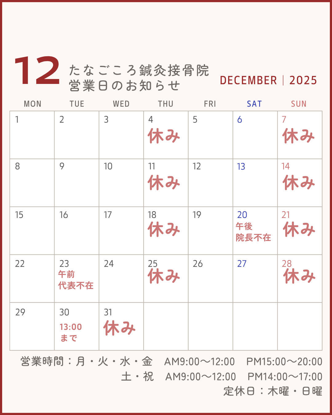 ※祝祭日の翌日は休みです。